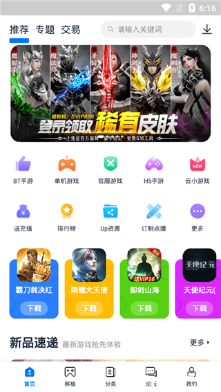 作为一款专注于BT手游多年的游戏盒子,它一直致力为玩家提供各大手机游戏公益服,满V版手游、GM手游及手机网游无限钻石元宝等游戏,精彩不容错过,开服信息随时了解,最新消息保证能够第一时间告知于你,同时不知道玩什么的用户也可以在这里找到属于自己的那一款,多种多样类型的分类专题,总有一款能够打动你,细致分类更能贴近于你的内心!热门专题打造最热榜单,最多人下载和最新推出下载能够让你了解到最近都有哪些好玩的游戏,毕竟一款游戏人多玩起来更有意思嘛!当然了这里不仅也包含了软件自带的推荐手游功能,同时你也可以将自己喜欢的网游通过软件的移植功能下载到手机上,并且之后可以在个人中心的收藏功能中找到自己所下载的游戏进行畅玩!可谓是周到至极!值得一提的是在这款