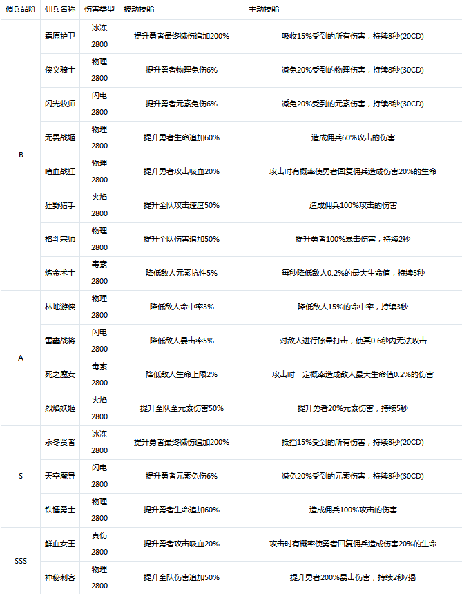 1.每一位佣兵都有主动技能和被动技能,能为勇者大人提供全方位的辅助效果。