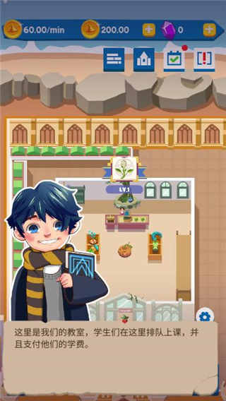 6、麻瓜学院我是院长无限金币版中放置休闲的玩法,随时随地帮你赚取金币,随时放置运行策略。