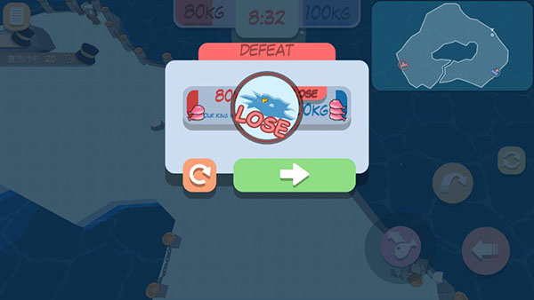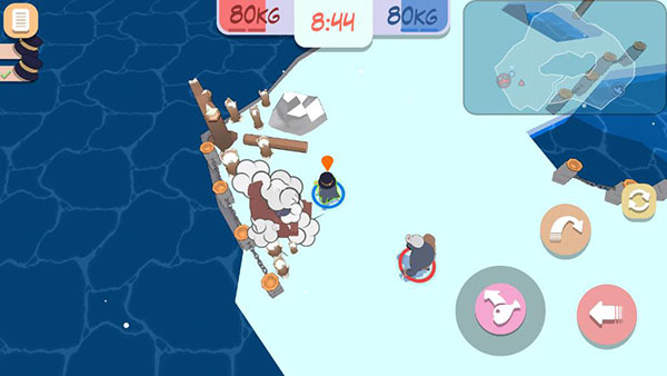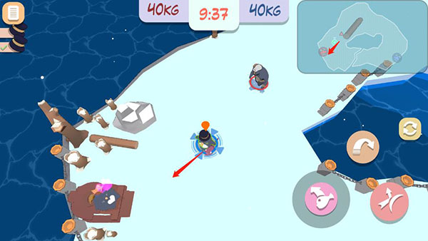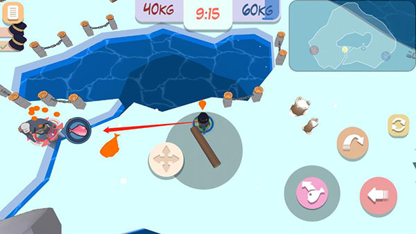以上为玩家朋友简单的介绍这款游戏的相关操作,接下来再说一下当玩家进入游戏后,会在上方显示当前比赛的比分情况和比赛所剩下的时间,虽然操作相对于简单一些,但作为竞技类游戏紧张的气氛还是很浓类,容不得片刻容缓。而在玩家们持鱼的情况下,点击拖拽就能进行瞄准扔鱼的方向,扔出鲑鱼,以便增加自己的移动速度。