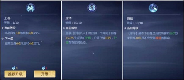 【上善】:提高生命上限和暴击几率,不建议升级。