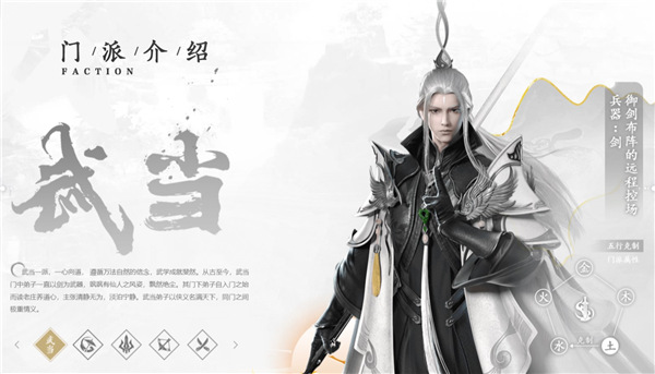 武当一派,一心向道, 遵循万法自然的信念,武学成就斐然。从古至今,武当门中弟子一直以剑为武器,飒飒有仙人之风姿,飘然绝尘。其门下弟子自入门之始而读老庄养道心,主张清静无为,淡泊宁静。武当弟子以侠义名满天下,同门之间极重情义。