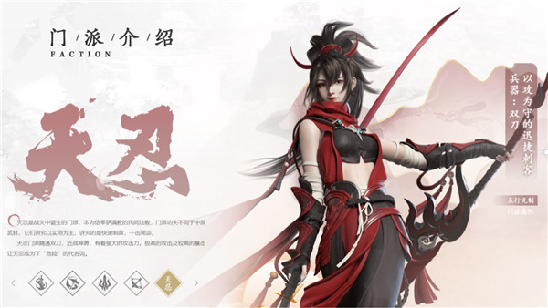 天忍门派精通双刀,近战神勇,有着强大的攻击力。极高的攻击及较高的暴击让天忍成为了“危险”的代名词。