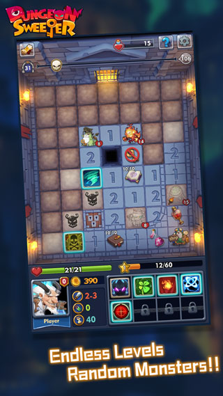 一款有趣的冒险游戏。该游戏将扫雷和自由探索冒险玩法两者相结合在一起,玩法独特有创新,上手操作也简单,在经典扫雷的玩法上加入了魔幻题材的元素。在游戏中玩家扮演一名英雄前往地牢,英雄角色各种各样,玩家可自行选择,在这里你需要利用一切能利用的道具和办法来躲避,地牢中各个未知的地方所隐藏的陷阱,成功闯关。扫雷无尽地牢游戏内的关卡众多,因此带给玩家的体验将会非常精彩,探索不同级别的地牢,体验全新的冒险挑战,益智扫雷游戏的翻牌玩法,让你每次的翻牌都充满了神秘,现在就前往地牢深处,深入魔界!玩家在每次通关之后就可以去解锁一个角色人物,还可以去挑战大BOSS前往更高的楼层进行探索。