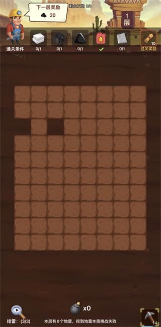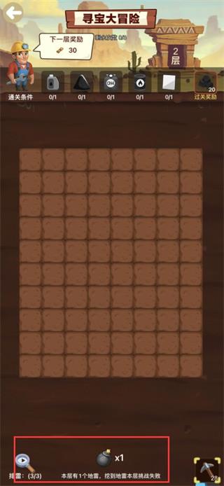 大冒险中奖励丰富,一共有10层,从第二层开始每增加一层则增加一个炸弹陷阱,所以还是有些难度的接下来我就为各位玩家尽量达到最高的一层,最重要的是在大冒险里是不会消耗铁镐的!