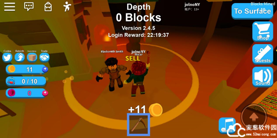 当背包装满后,我们直接点击右上角的传送就能直接回到地面了。这时候去找标有出售的铁匠,进入黄色的圈圈就能自动将背包里的矿石换成金币,然后就可以继续去快乐挖矿了!