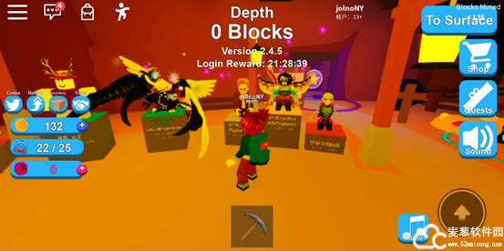 当拥有一定数量的金币后,我们可以去找标有购买标识的商人购物!进入黄色圈圈后,会弹出商店界面,共有四个分类,分别是工具、背包、装扮(可以购买一些发型、宠物等)和重生商店(可以购买一些道具)。前期主要是购买更高级的工具和背包,这样就不用频繁回到地面,提高挖矿(赚钱)的效率~拥有高级的道具后,我们就能逐渐深入更下层的地里挖矿,能挖到更好的东西,运气好的话能挖到金箱子、钻石等,但对应的,需要的挖矿工具级别会很高!