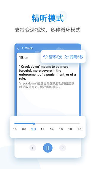 5、播放调节:8档语速调节、4种循环模式,单句精听、听写、测验,满足不同阶段的需求;