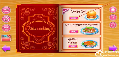 2、点击右下角的箭头可以打开菜谱和翻页,选中想做的菜品点击play就可以开始制作