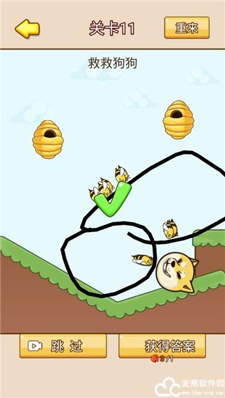 救救狗狗小游戏是一款非常有趣的休闲娱乐手游,是全面烧脑游戏中的一个玩法,随后又被拎出来制作成了一个单独的游戏,采用了Q版卡通的风格设计画面,整体的画面非常的简约但不简陋,加上轻松的背景音乐,能够带给你轻松休闲的游戏体验。游戏以保护作死的狗狗为核心,狗狗经常招惹蜜蜂或者是将自己处于一个危险的地方,为了保护狗狗,你需要通过画线的方式来阻止蜜蜂或者是其他物品伤害狗狗。在救救狗狗中,有着丰富的的关卡内容,每一个关卡都有着一个不同的场景,你需要结合场景中的内容来画出各种各样的图形或者是线条来保护狗狗,不能让狗狗掉落或者是被叮,当然,只需要坚持十秒即可通过,至于之后狗狗是否被叮那就对我们没有影响了,因此有些玩家就发散自己的思维,在通过的前提下还能够让狗狗被叮,非常的有趣。