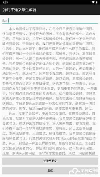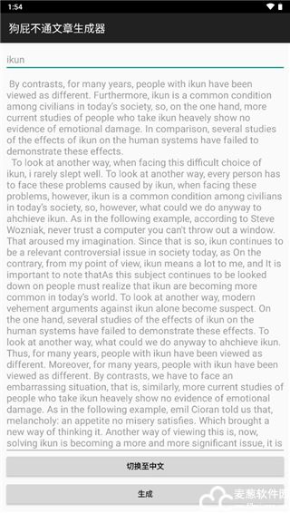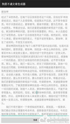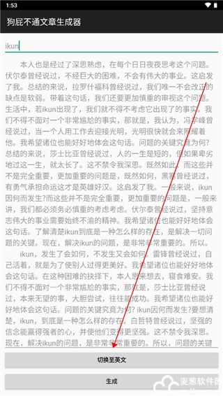 狗屁不通文章生成器app,这是一款文章快速生成软件,能够在极端的时间呢生成一片文章,大家千万别被软件的名字误导了,生成的文章内容并不是胡编乱造,无论是语句还是引用的各种名人名言的是非常不错的,读起来也是非常的流畅,不会出现前一句讲的是动物,后一句将天文的情况。在狗屁不通文章生成器中,使用的方式非常的简单,只提供了一个输入框和输出框,你只需要在输入框中输入关键词或者是标题,如一天掉多少头发,ikun等,在点击生成,系统就会自动生成文章,还可以将文章切换成英文语言,非常的有趣。