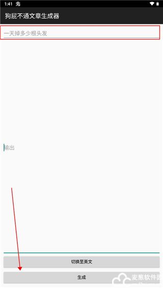 1、首先进入软件,在界面上方的标题栏输入标题,随后点击生成,软件就会生成文章了,小编以一天掉多少根头发为例
