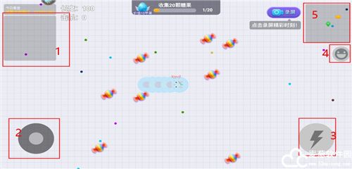 2、进入游戏之后,这里有着各种按键和辅助功能,如下图所示,小编将需要用到的功能全部标记出来了,其中1代表着排行榜,2是移动遥杆,用来控制小蛇移动,3是加速,可以加快移速但是会让身体变短,4是表情,5是地图,不过只会显示自己和 第一名的位置