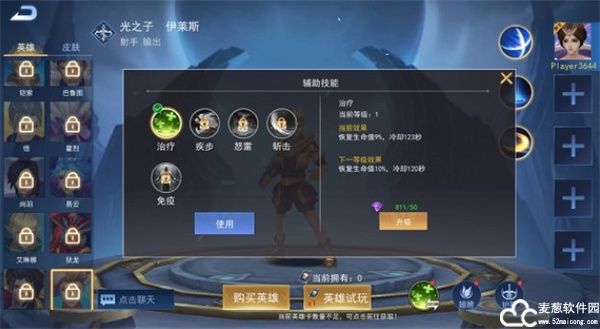 2、英雄选择界面,可以选择携带辅助技能,就是lol里面的召唤师技能,目前只有五种;