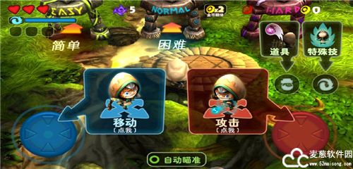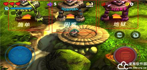 3、通过左侧的虚拟遥杆可以控制角色移动,右侧则是攻击按键,这里为你带来了三种难度,简单,困难和地狱,将角色移动到相对应的门下面即可选择难度