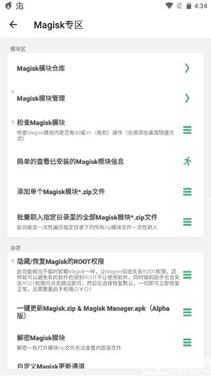 3、magisk专区,能帮助您管理模块、查看更新、添加或者删除等,让您的使用变得轻松;
