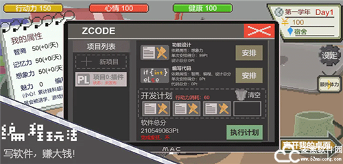 3、玩家需要不断提升角色各方面的属性,包括编程、做项目、赚钱。