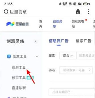 2、进入如下界面,展开第一个创意工具可以看到前测工具;