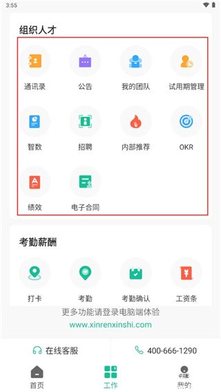 3、在工作页面中,有绩效,电子合同,招聘,试用期管理等功能,能够更好的对员工进行管理
