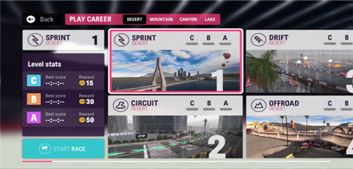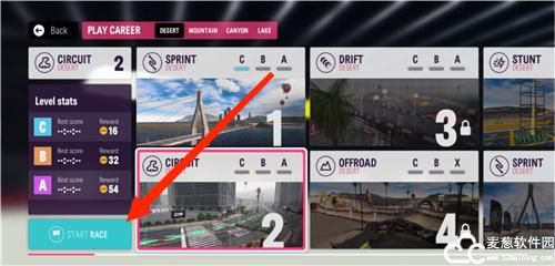 2、点击CAREER进入关卡选择界面,选择好关卡之后点击左下角的START RACE开始比赛