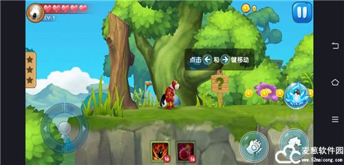 3、进入关卡之后,通过左侧的遥杆来控制角色的左右移动,右侧的按键分别是攻击,跳跃,和宠物技能,页面正下方的是道具,根据要求完成任务即可通过关卡
