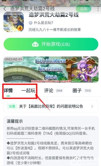 2、不要直接点击云玩,在下方详情的旁边有一个一起玩按钮,点击它;