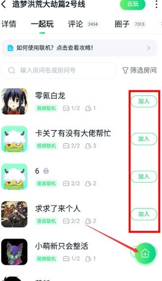 3、有很多小伙伴在这里找人一起玩,可以点击加入,也能自己创建房间;
