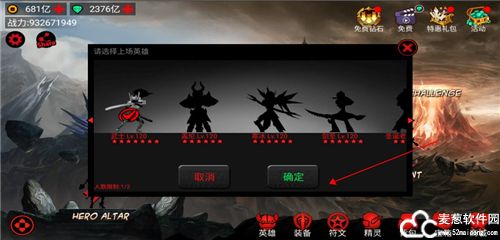 2、选择好之后选择你要挑战的关卡,随后选择你要上阵的英雄,一局战斗中只能上阵两个英雄,选择好之后点击确定就可以开始战斗了