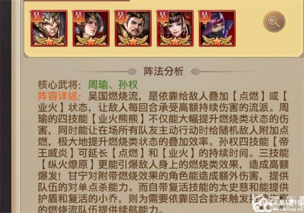 二、吴国燃烧流:吴太史慈 吴周瑜 吴孙权 吴小乔 吴甘宁。核心武将周瑜,孙权。思路如下图。