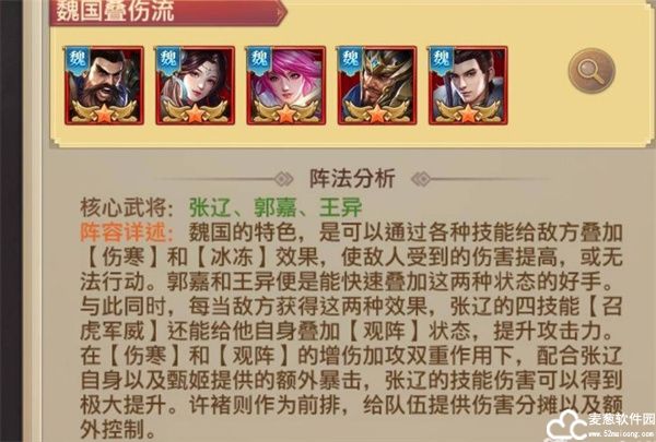 三、魏国叠伤流:魏许诸 魏甄姬 魏王异 魏张辽 魏郭嘉。核心武将:张辽、郭嘉、王异。搭配思路如下。