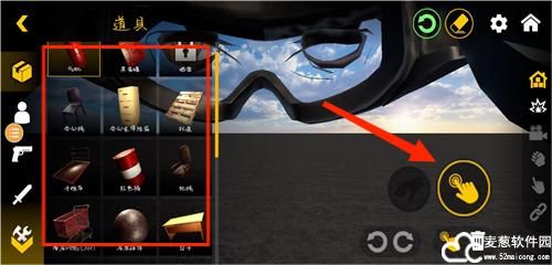 3、进入地图之后,你可以通过左上角的沙盒选项了增加物品,这里有道具,NPC,枪械,冷兵器等内容,选择需要的物品之后点击右侧黄色的手就可以放置了