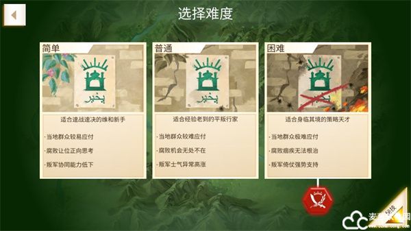 1、游戏提供有四个难度,困难下方的按钮可以开启枭雄模式,根据自身需要来选择哦;