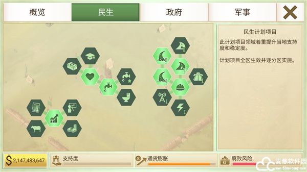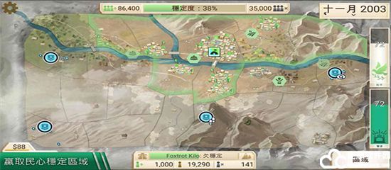 进入游戏之后,你的军队需要驻扎在当地并且不断壮大实力,操作菜单分为概览、平民、政府和军队四个选择,你需要获得资金保证政府运作,修建水电、医疗、交通、通讯等基础设施提高经济发展水平和当地人支持率,同时要预防腐败以免祸起萧墙。