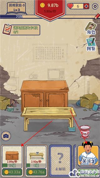 1、首先打开游戏,在这里你需要通过闯关来获取金币并增添家具,点击家具可以升级,从而获取更多的金币收益,点击右下角的关卡开始闯关