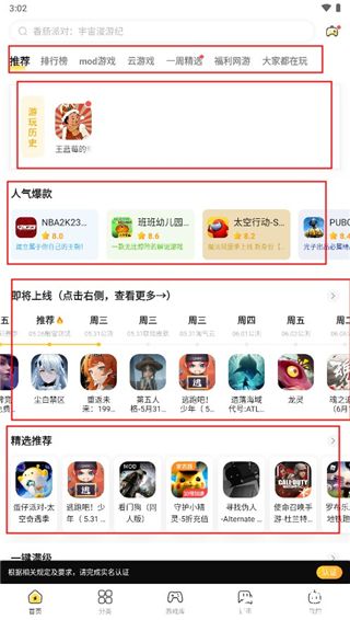 1、首先进入软件,这里为大家带来了大量的游戏推荐,如人气爆款,即将上线,精选推荐,一键满级等