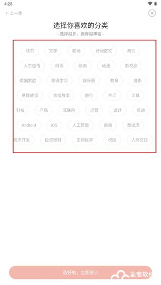2、选择自己喜欢的分类,如读书,文学,前端,后端等,系统会默认加入综合和最新两个分类