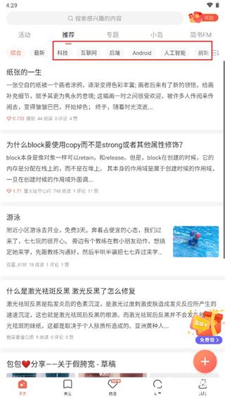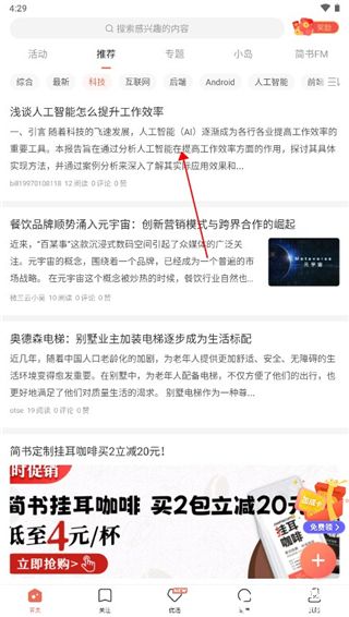 在简书app中,你可以在这里查看各种类型的文章,并与其他用户分享自己的想法。