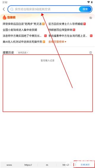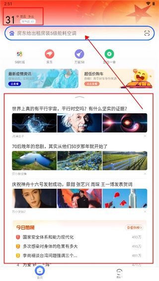 1、首先打开软件,进入首页之后,在下方的内容中会为用户带来大量的热点资讯,在页面的左上角的是天气,点击即可进入查看,点击搜索栏进入搜索页面