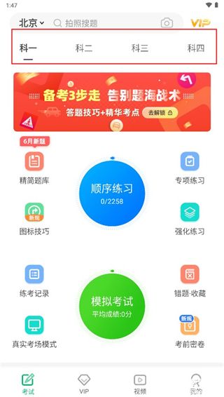2、随后,用户可以根据自己的驾照考试阶段来进行学习,上方从科一到科四,所有的内容都有,还有着精简题库,专项练习,图标技巧等功能,点击顺序练习