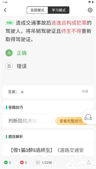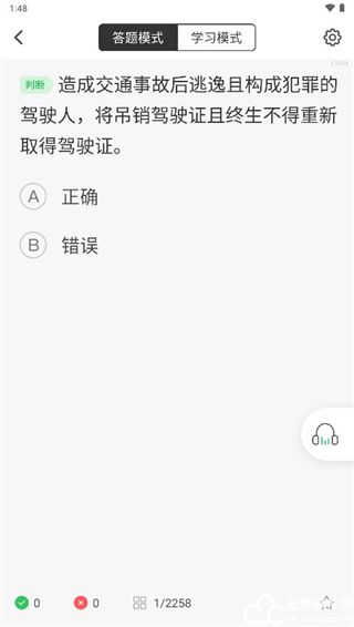 4、练习中有两种模式,打答题模式和学习模式,在答题模式中主要是刷题,在学习模式中有着题目的答案和相关解析,帮助用户更好的进行学习
