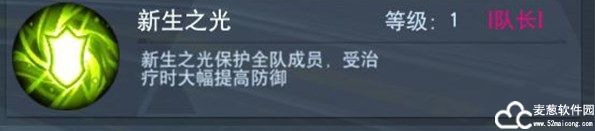 队长技能:新生之光新生之光保护全队成员,受到治疗效果时防御力大幅度提升