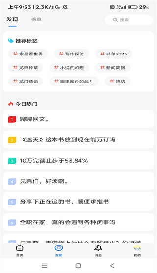 页面有首页、发现、消息、我的四个模块
