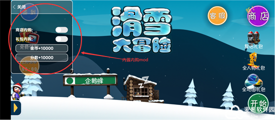 内置内购mod,可以加金币10000和分数10000,为了游戏的愉悦性和有趣性,可以直接在商店里面直接在里面购买就可以使用靓丽的坐骑和皮肤了,设置地图场景也是必不可少的,我们通过滑雪生存指南,点击开始按钮就可以开始刺激的滑雪了。