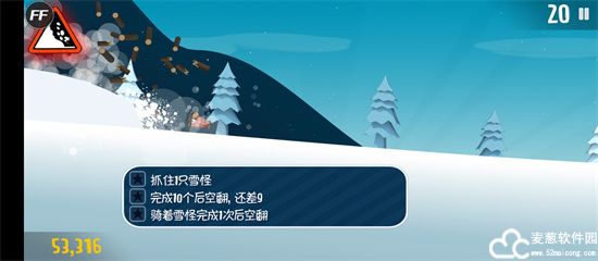 雪崩在即,速度与激情瞬间点燃,根据危险提示尽量少犯错误,根据任务指示完成相应任务,滑雪大冒险无限金币无限钻石版开局可以使用道具加快进度,加速分为坐骑和道具两种加速,玩家点击一下屏幕角色会跳一下,长按会逆时针旋转,如果碰到了事故摔倒了,要频繁的点击屏幕才能更快的使玩家重新站起来,否则时间一长些雪崩会覆盖你,完成任务还会有军衔的提升。失败后还可以继续用金币复活,坐骑可以保角色一次生命,有颜色的冲刺是无敌状态,可以撞碎石头。
