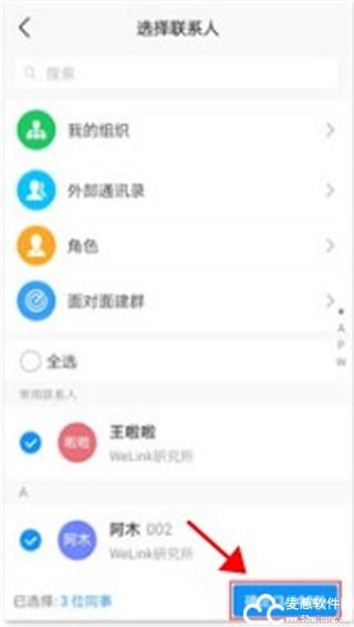 2、在选择联系人页面中,选择想要拉的人,随后点击右下角的确定