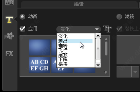 1-6、切换至“属性”面板,选中“应用”复选框。在“选取动画类型”下拉列表中选中“弹出”选项,并选中合适的类型