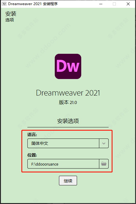2、直接双击“Set-up.exe”即可开始安装,支持选择简体中文语言,和自定义安装目录安装dw2021;