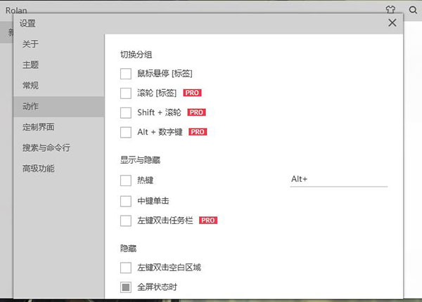 热键绑定可以给动作绑定一个全局按键,按下热键即可执行相应的动作。动作可以是启动应用、调用系统功能等,甚至是给其他应用设定显示隐藏热键,也可以与 Rolan 其他的组件结合使用