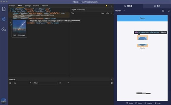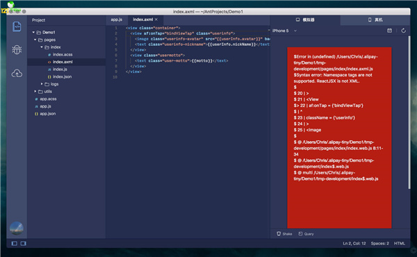 蚂蚁开发者工具任何代码的修改都会实时反应在模拟器上,并且为了便于调试,我们提供了诸如地理位置模拟等功能