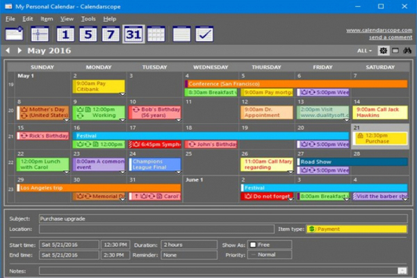 1、Calendarscope是一个功能齐全的日历软件,用于计划、管理和安排约会、会议、生日、假期和特殊事件。它允许您以每日、每周、每月或每年的概览查看所有事件
